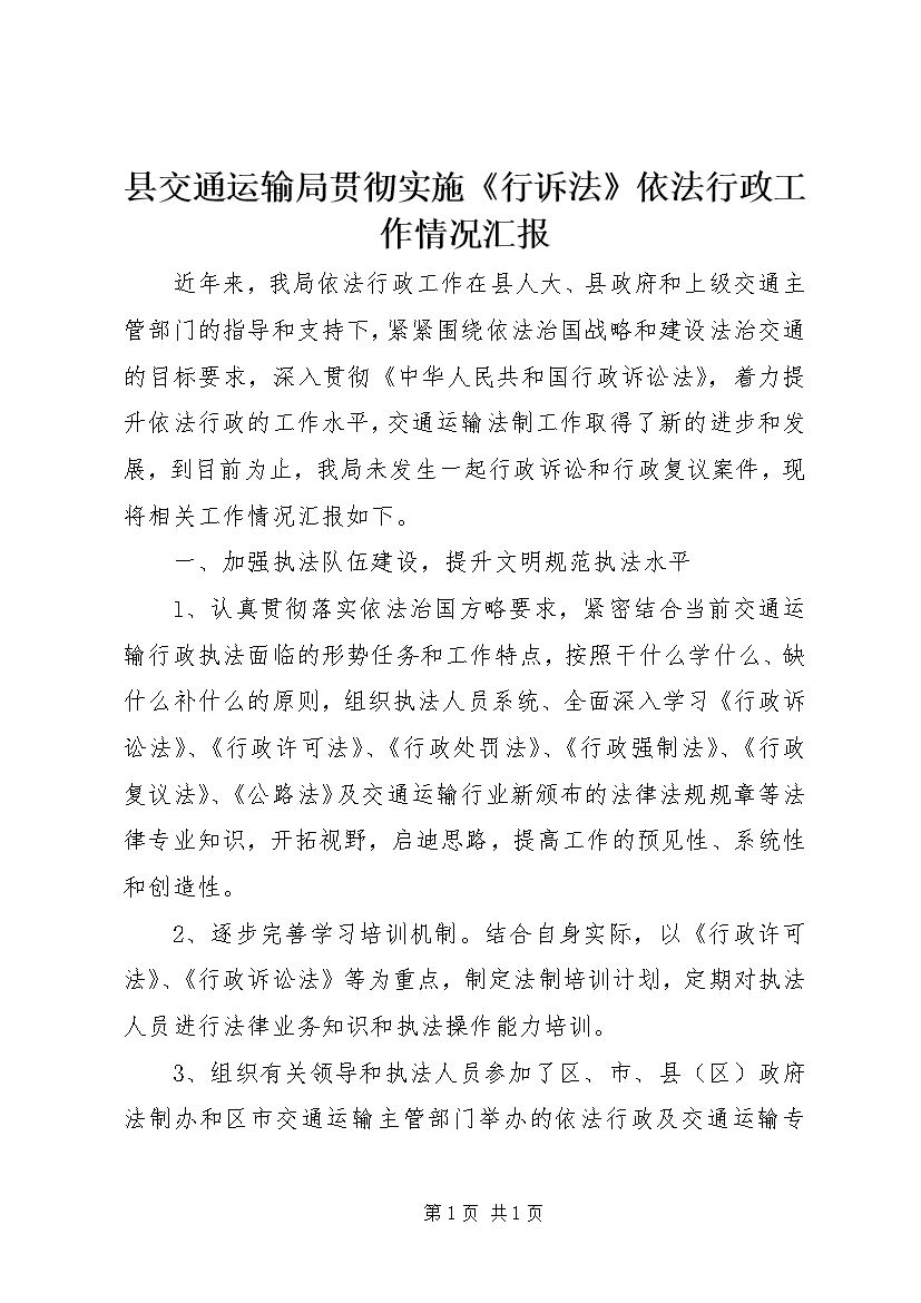 县交通运输局贯彻实施《行诉法》依法行政工作情况汇报