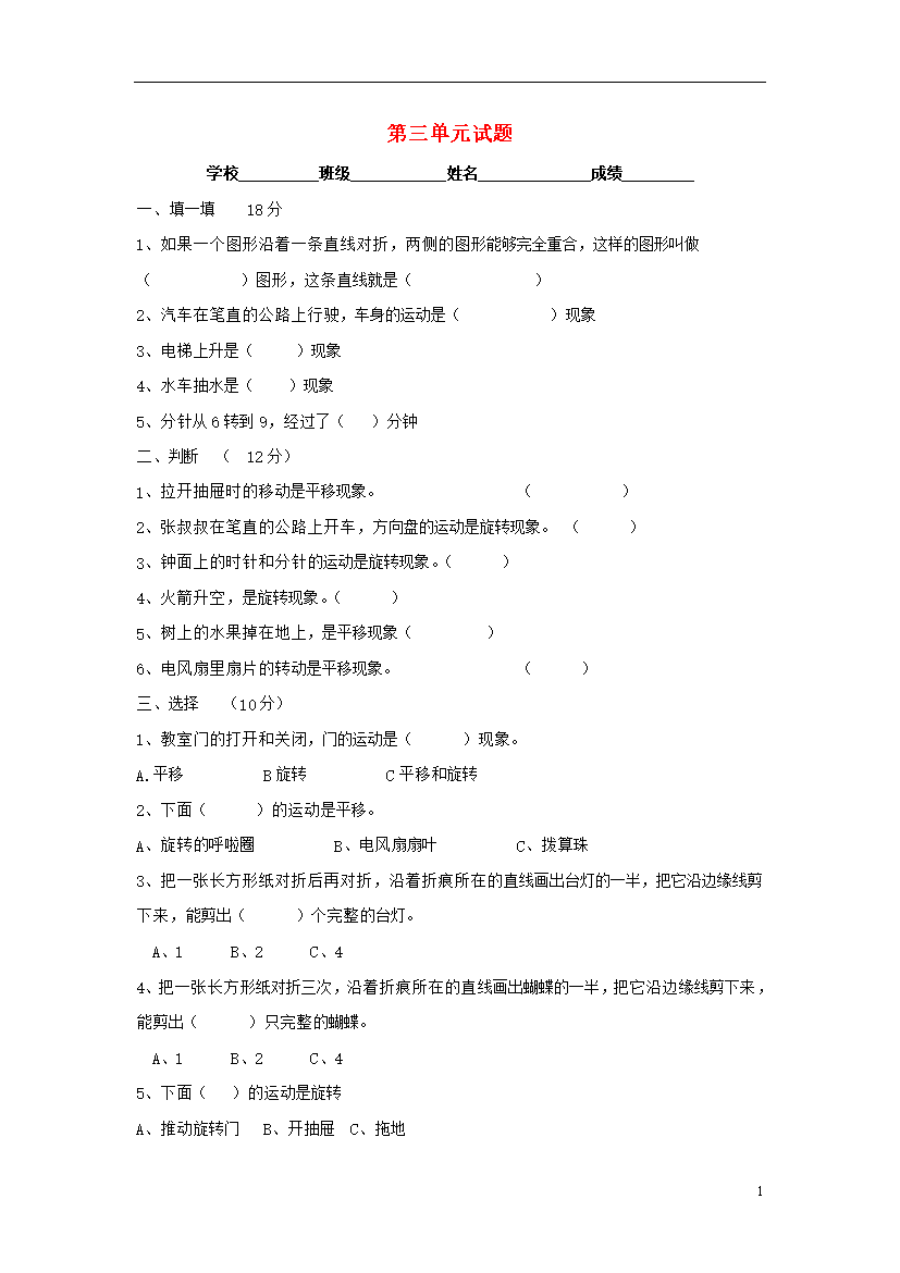 试题-全国-2016_二年级数学下册 第3单元 测试题(无答案) 新人教版