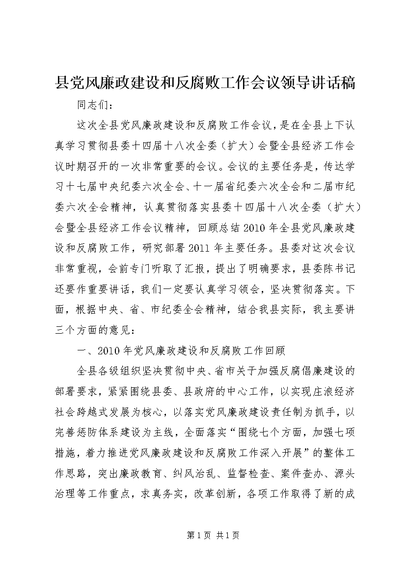 县党风廉政建设和反腐败工作会议领导讲话稿