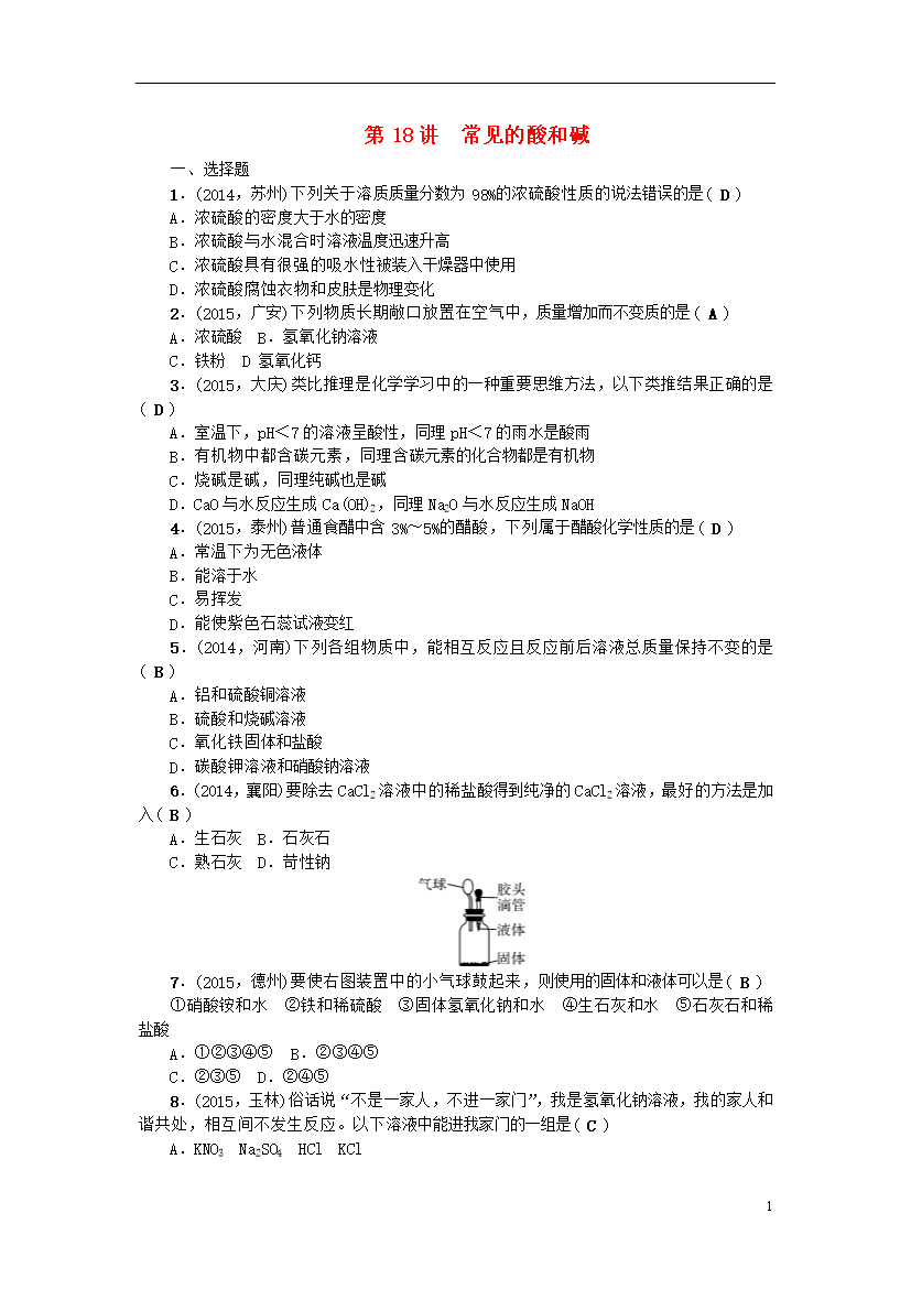试题-全国-2016_2016中考化学 考点跟踪突破 第18讲 常见的酸和碱练习