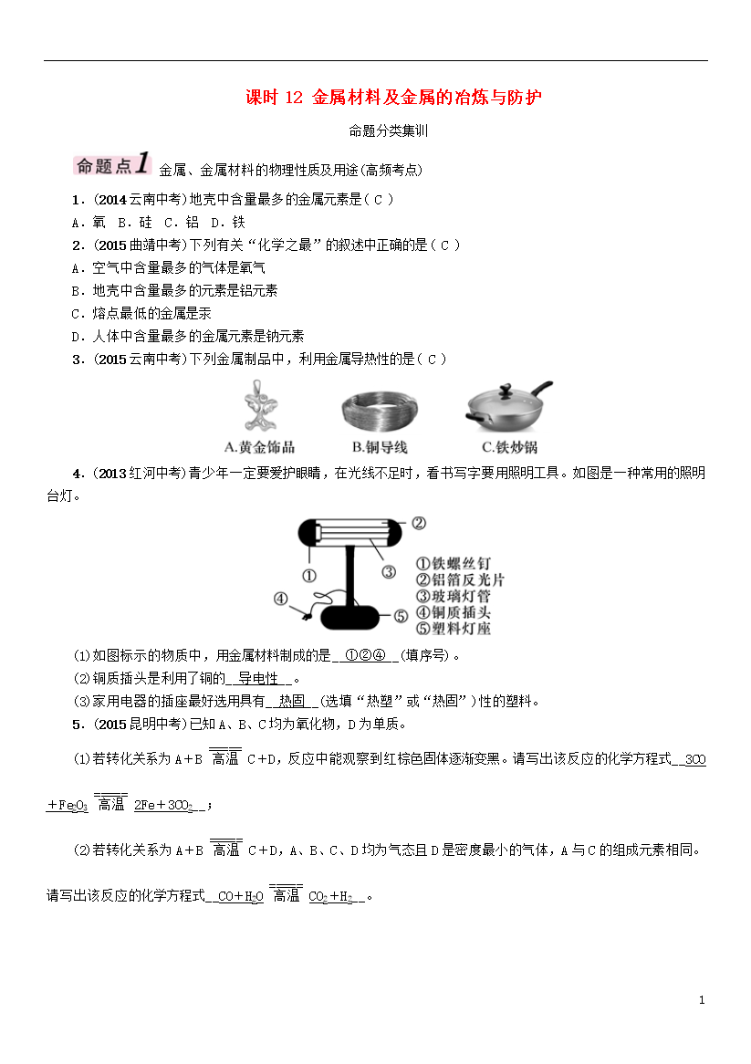 试题-全国-2016_中考命题研究(云南)2016中考化学 第一编 基础分类集训 课时12 金属材料及金属的冶炼与防护