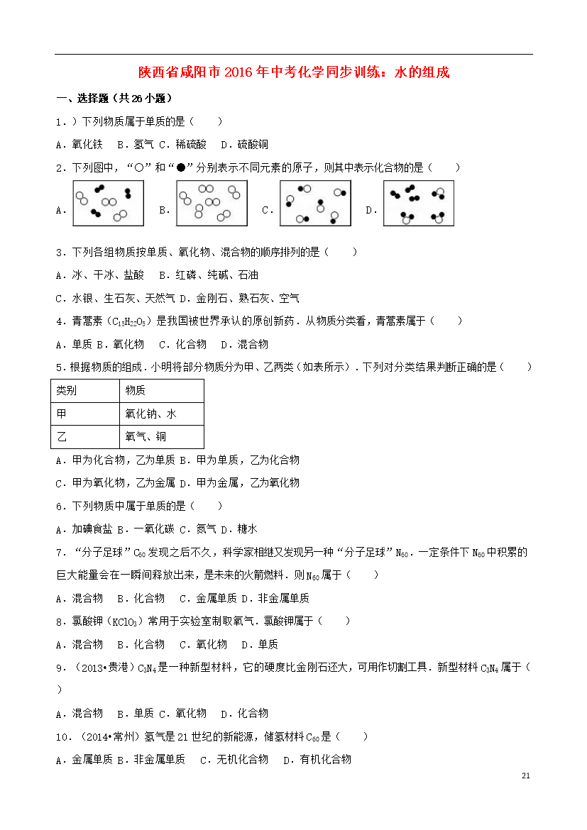 试题-陕西-2017_陕西省咸阳市2016年中考化学同步训练 水的组成(含解析)
