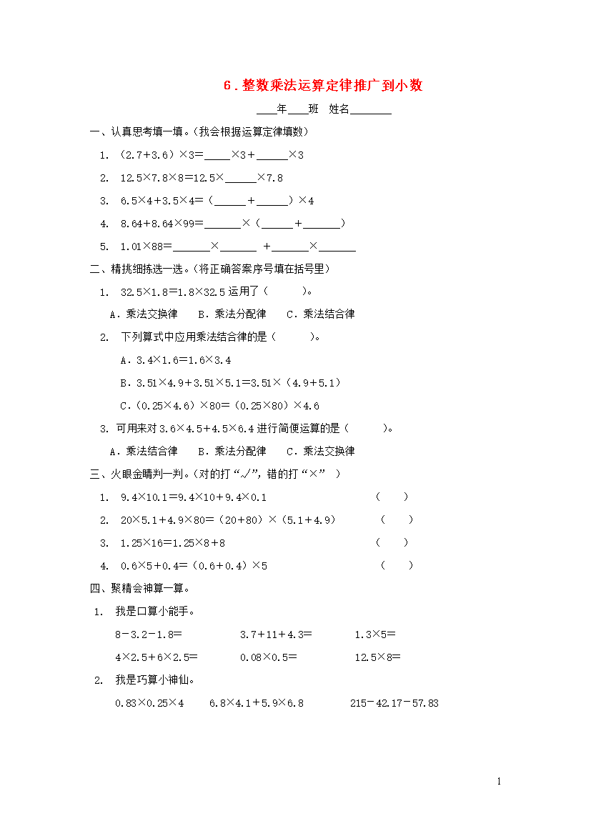 试题-全国-2019_五年级数学上册 第一单元 小数乘法 6整数乘法运算定律推广到小数一课一练(无答案) 新人教版