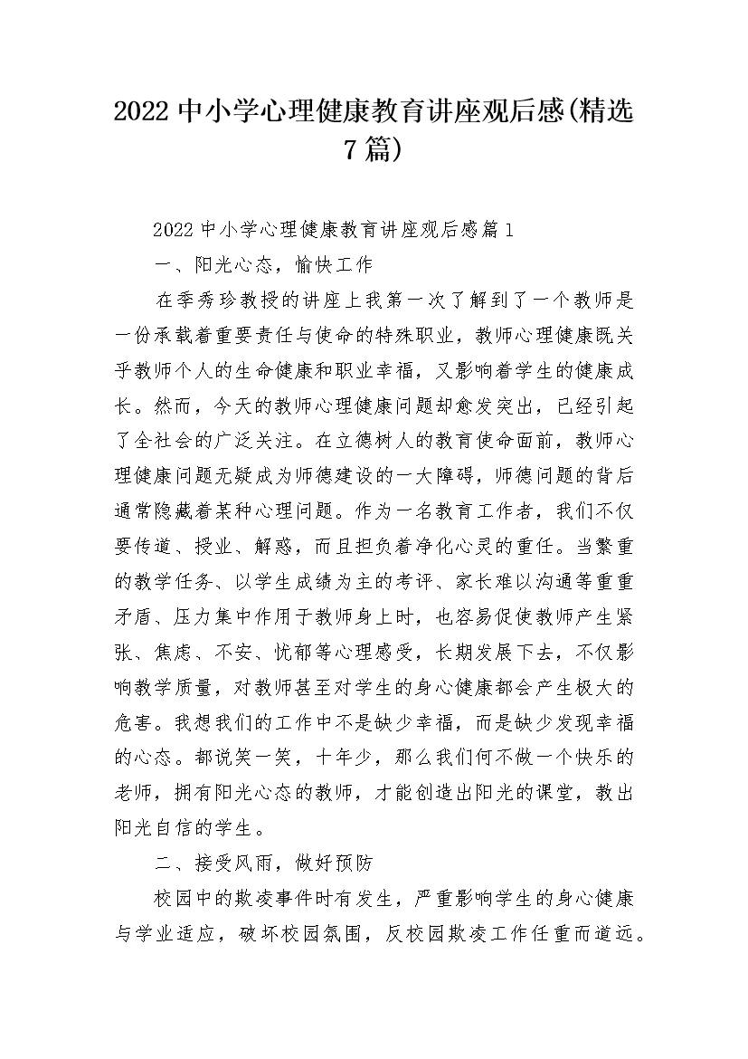 2022中小学心理健康教育讲座观后感(精选7篇)