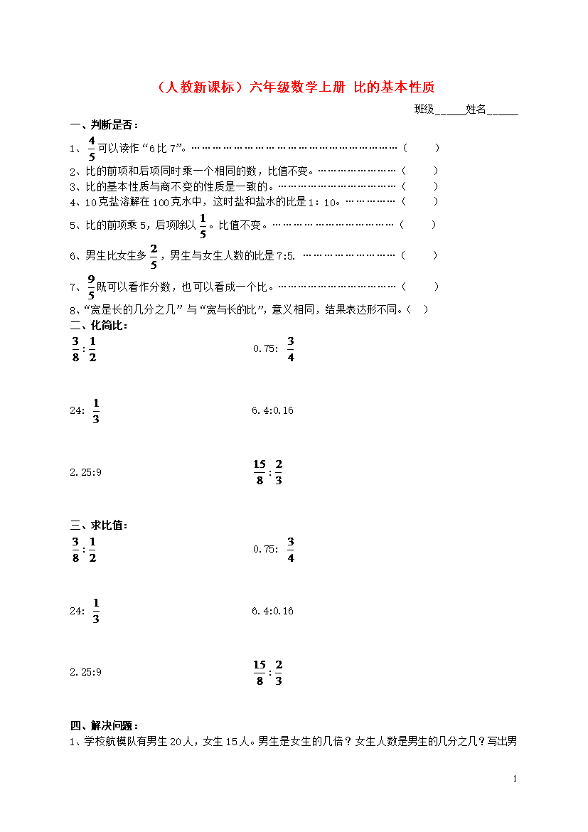 试题-全国-2011_六年级数学上册 比的基本性质 2一课一练 人教新课标版
