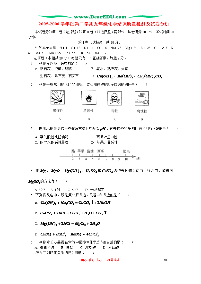 试题-全国-2006_2005-2006学年度第二学期九年级化学结课质量检测及试卷分析 人教四年制版