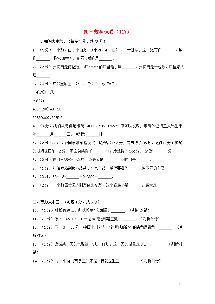 试题-全国-2017_四年级数学上学期期末试卷(117)新人教版