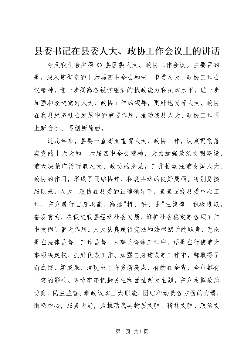 县委书记在县委人大、政协工作会议上的讲话 (2)
