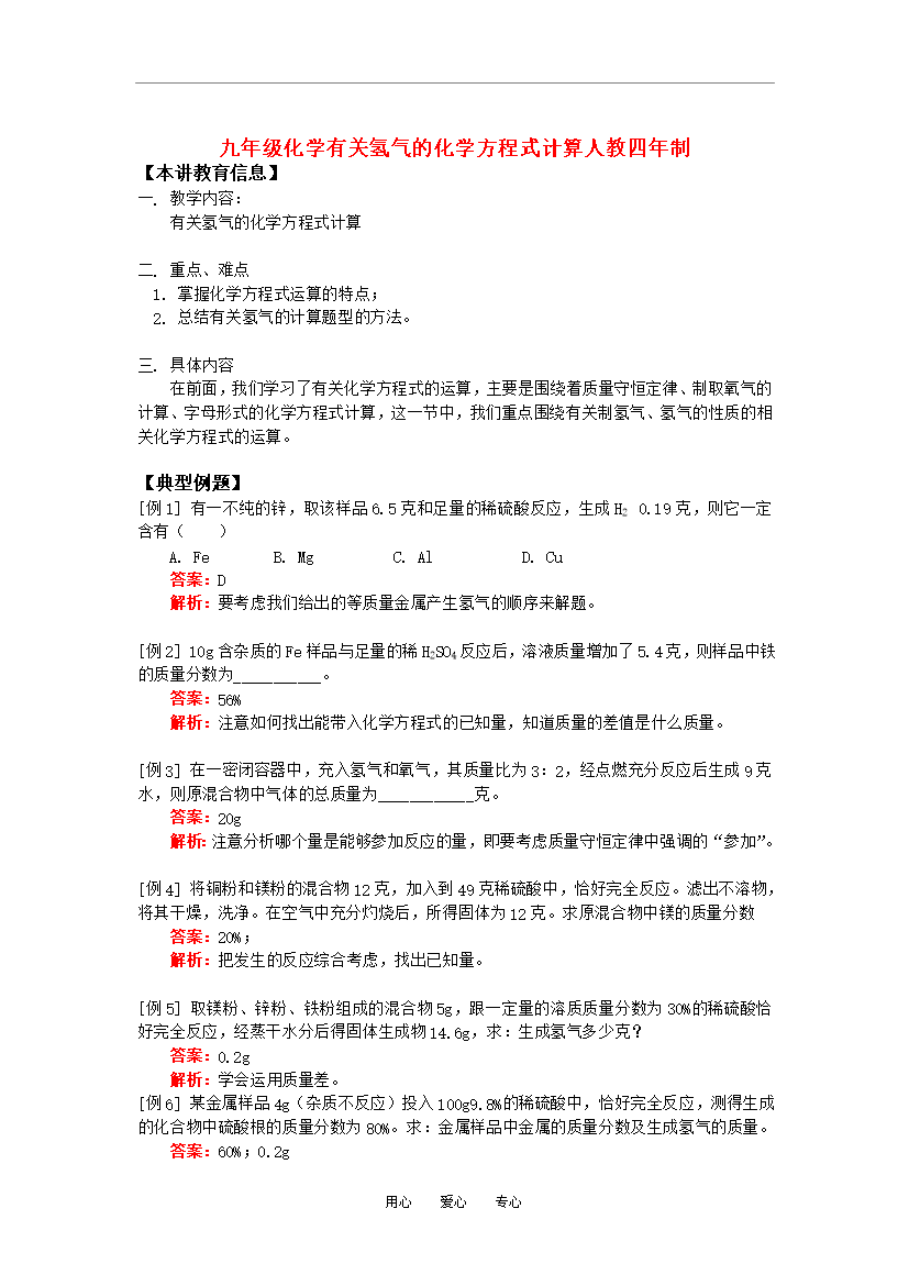 试题-全国-2009_九年级化学有关氢气的化学方程式计算人教四年制知识精讲