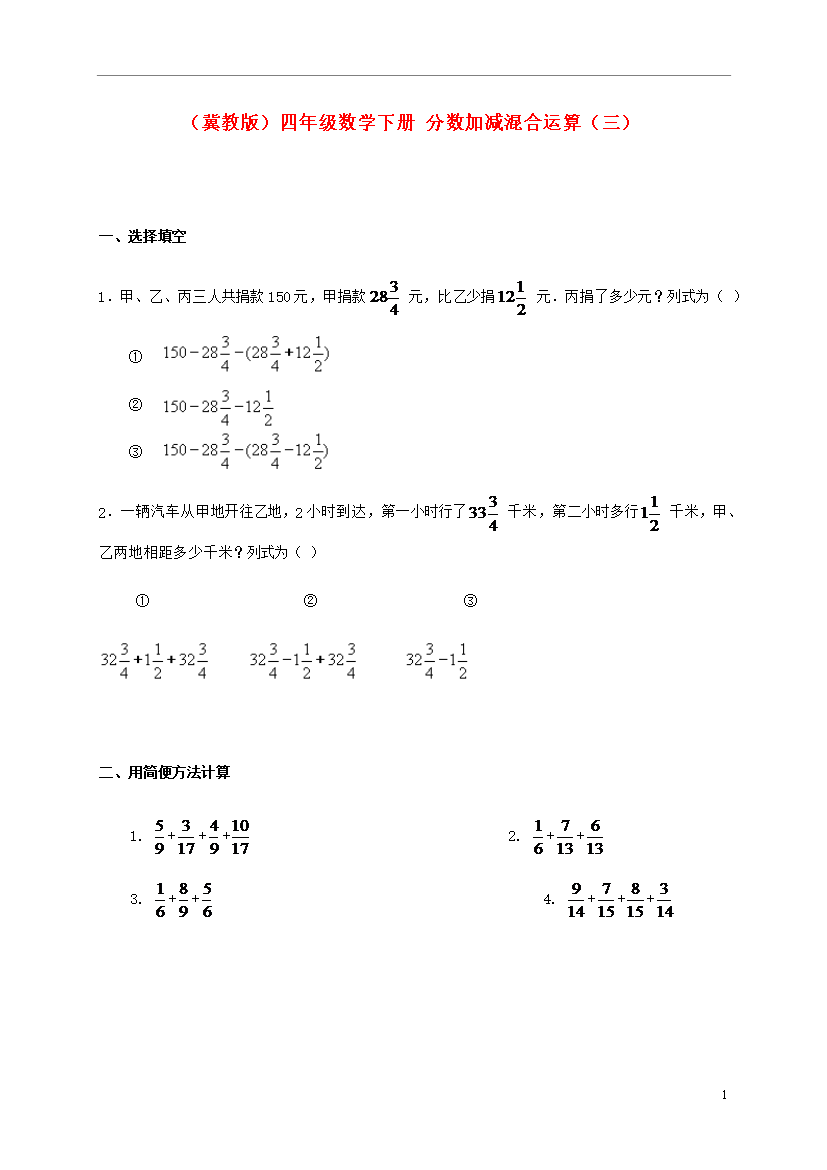 试题-全国-2012_四年级数学下册 分数加减混合运算(三)一课一练(无答案) 冀教版