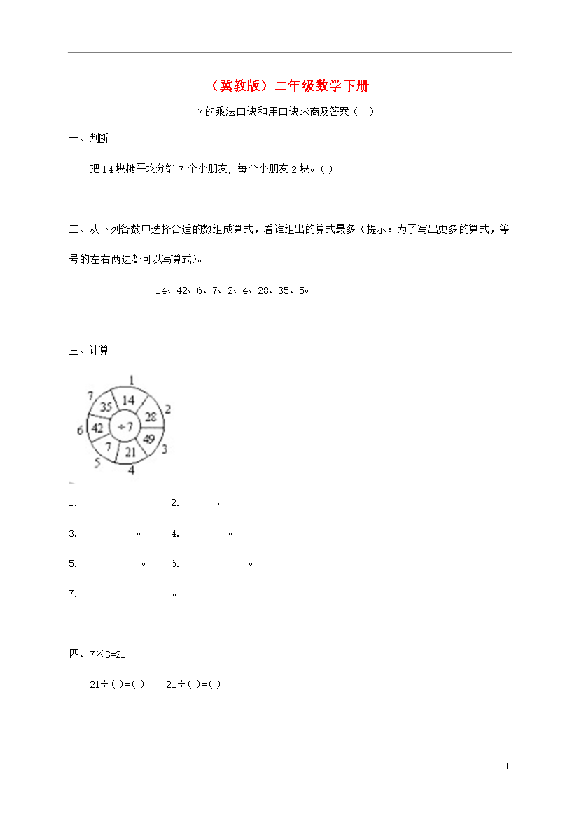 试题-全国-2012_二年级数学下册 7的乘法口诀和用口诀求商(一)一课一练 冀教版