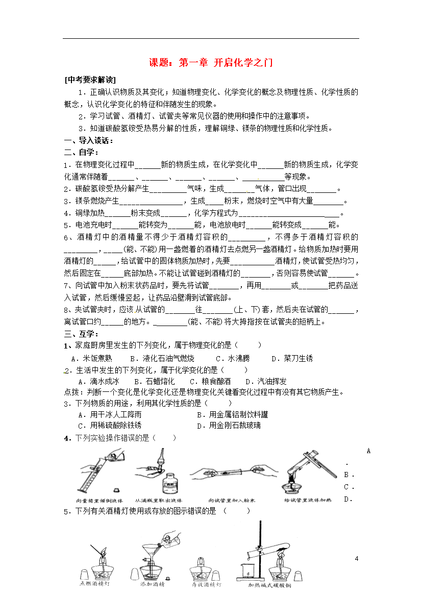 试题-江苏-2013_江苏省姜堰市蒋垛中学2013届九年级化学下册《第1章 开启化学之门》复习(无答案) 新人教版