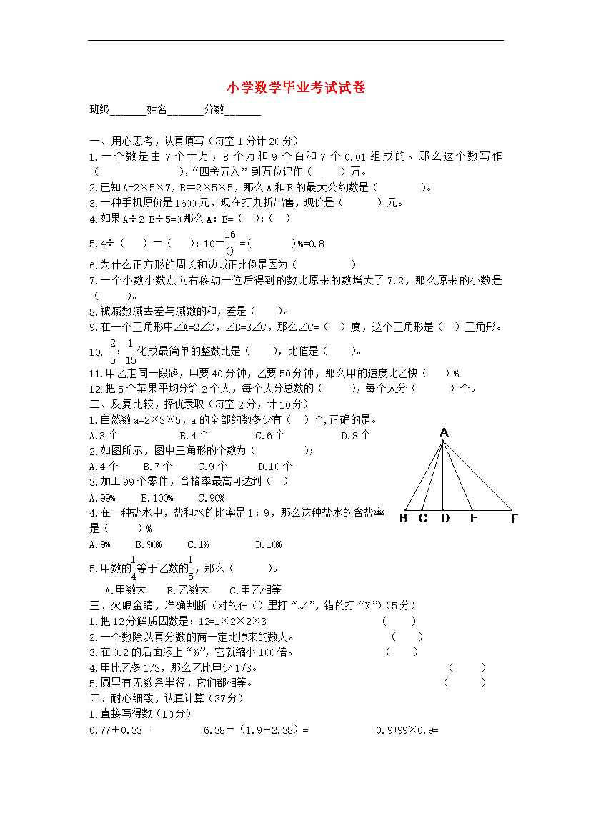 试题-全国-2013_六年级数学 小升初毕业试卷(无答案) 冀教版