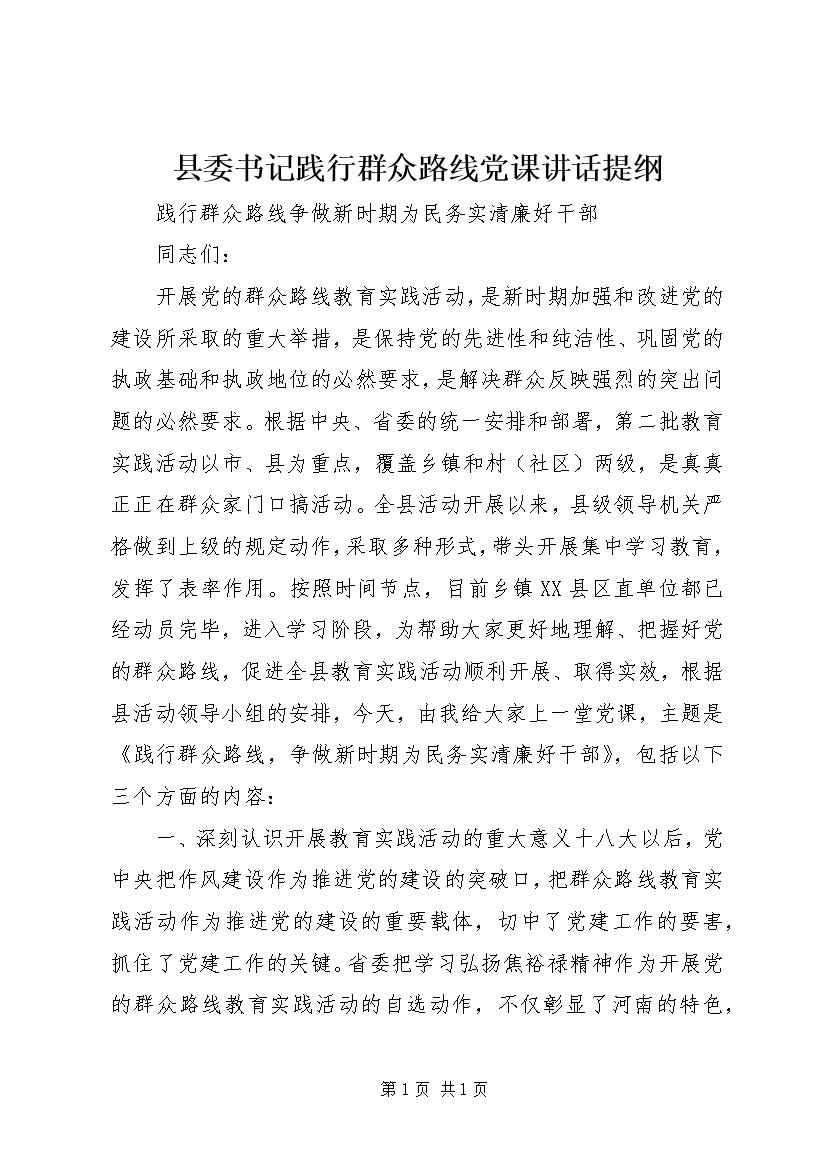 县委书记践行群众路线党课讲话提纲