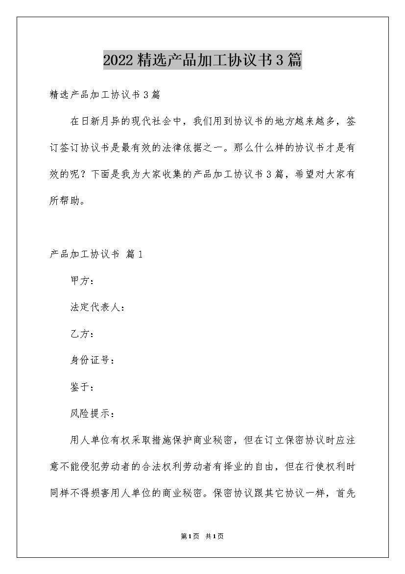 2022精选产品加工协议书3篇