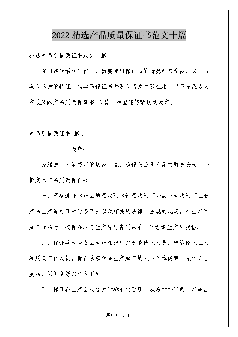 2022精选产品质量保证书范文十篇