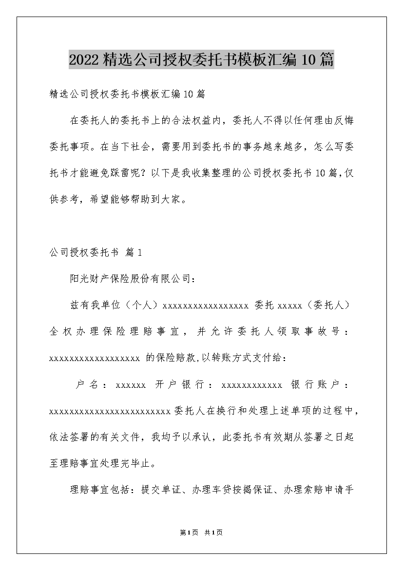 2022精选公司授权委托书模板汇编10篇