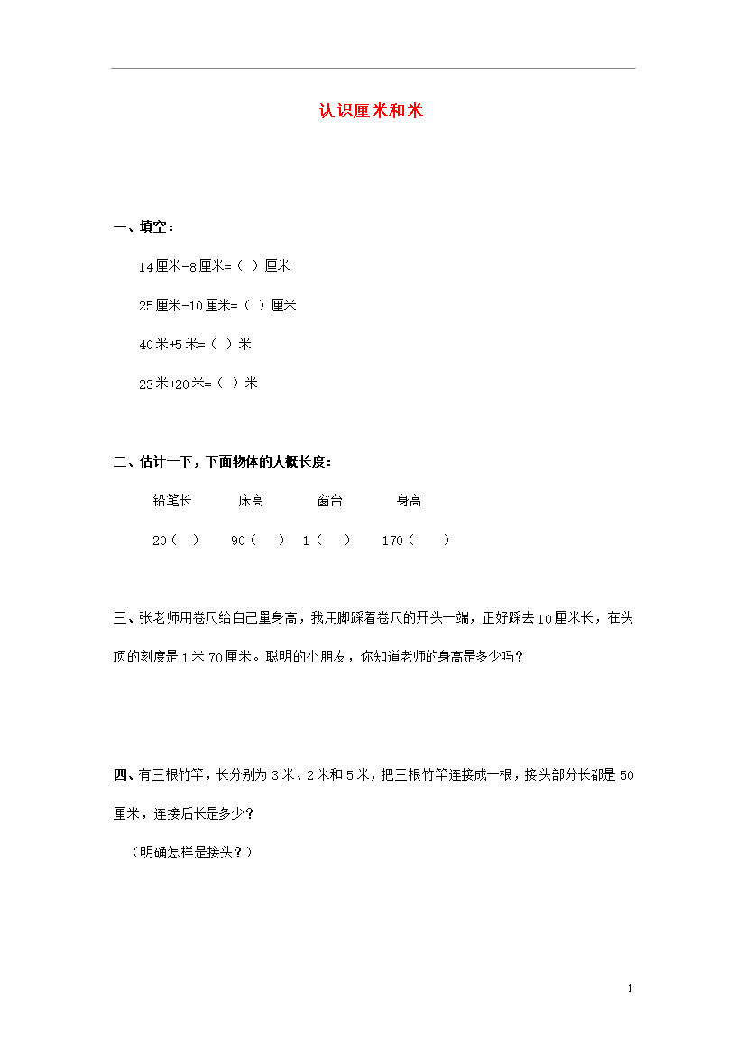 试题-全国-2015_2014二年级数学上册《一、认识厘米和米》练习题(无答案) 北京版