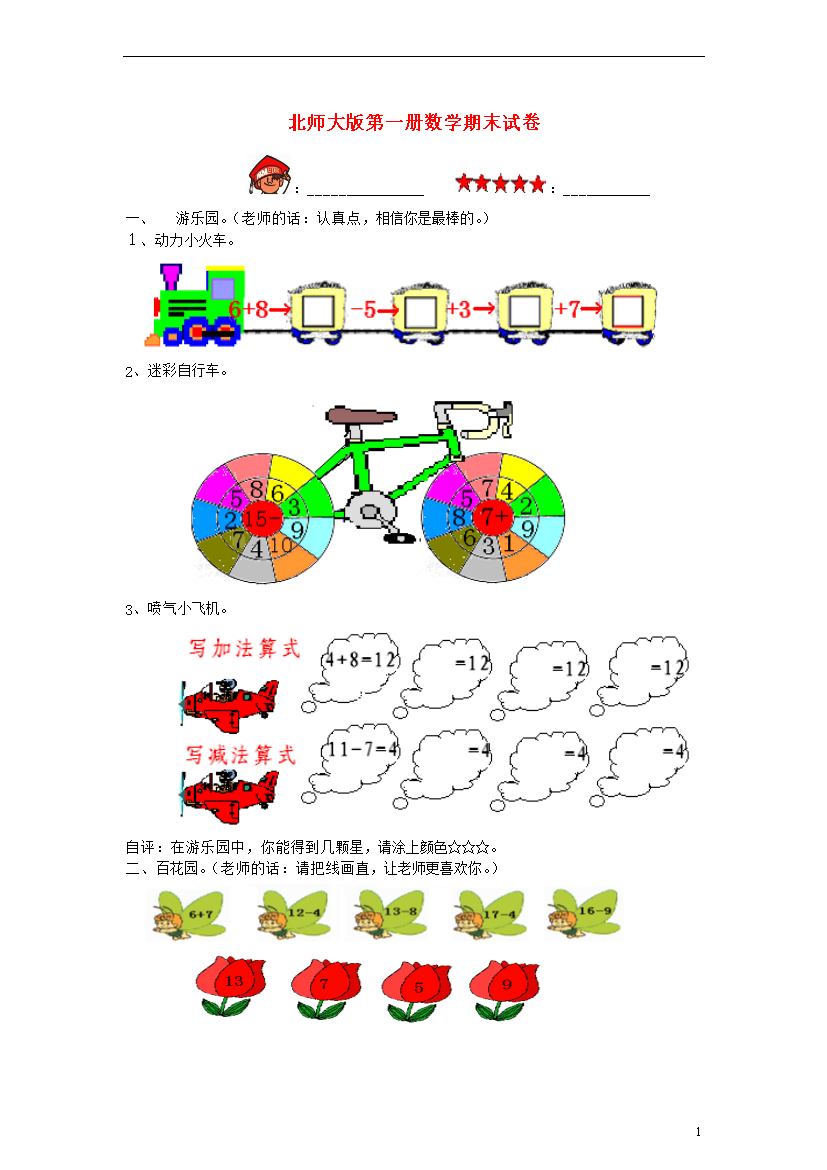 试题-全国-2013_一年级数学上册 期末试卷(无答案)北师大版