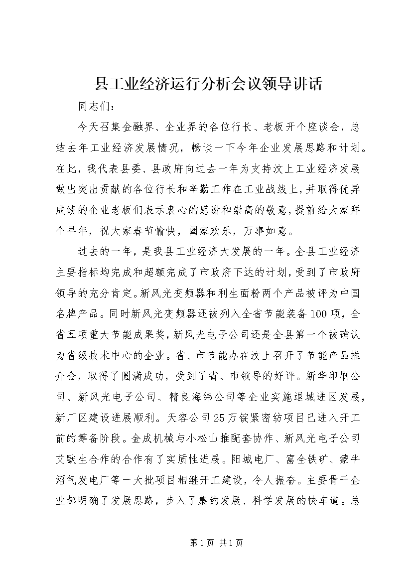 县工业经济运行分析会议领导讲话 (3)