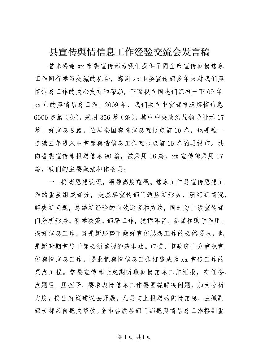 县宣传舆情信息工作经验交流会发言稿 (3)