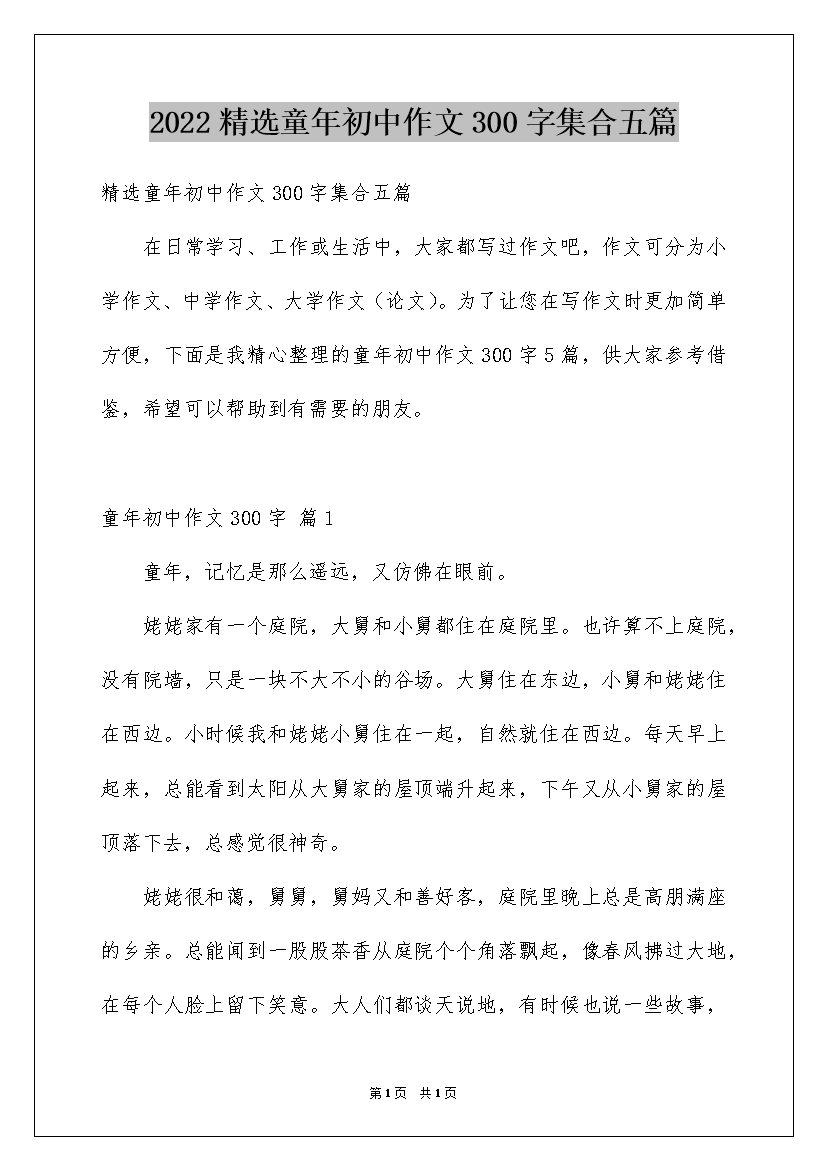 2022精选童年初中作文300字集合五篇