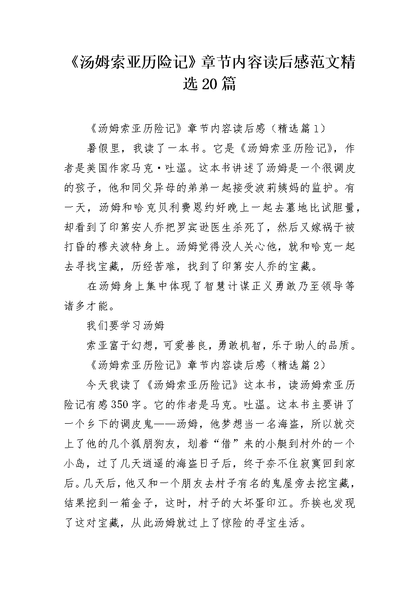 《汤姆索亚历险记》章节内容读后感范文精选20篇