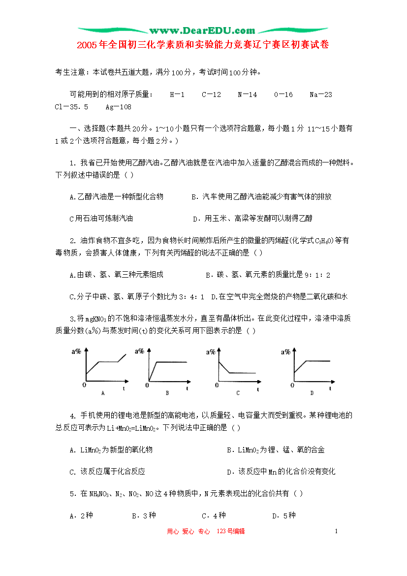 试题-辽宁-2006_2005年全国初三化学素质和实验能力竞赛辽宁赛区初赛试卷