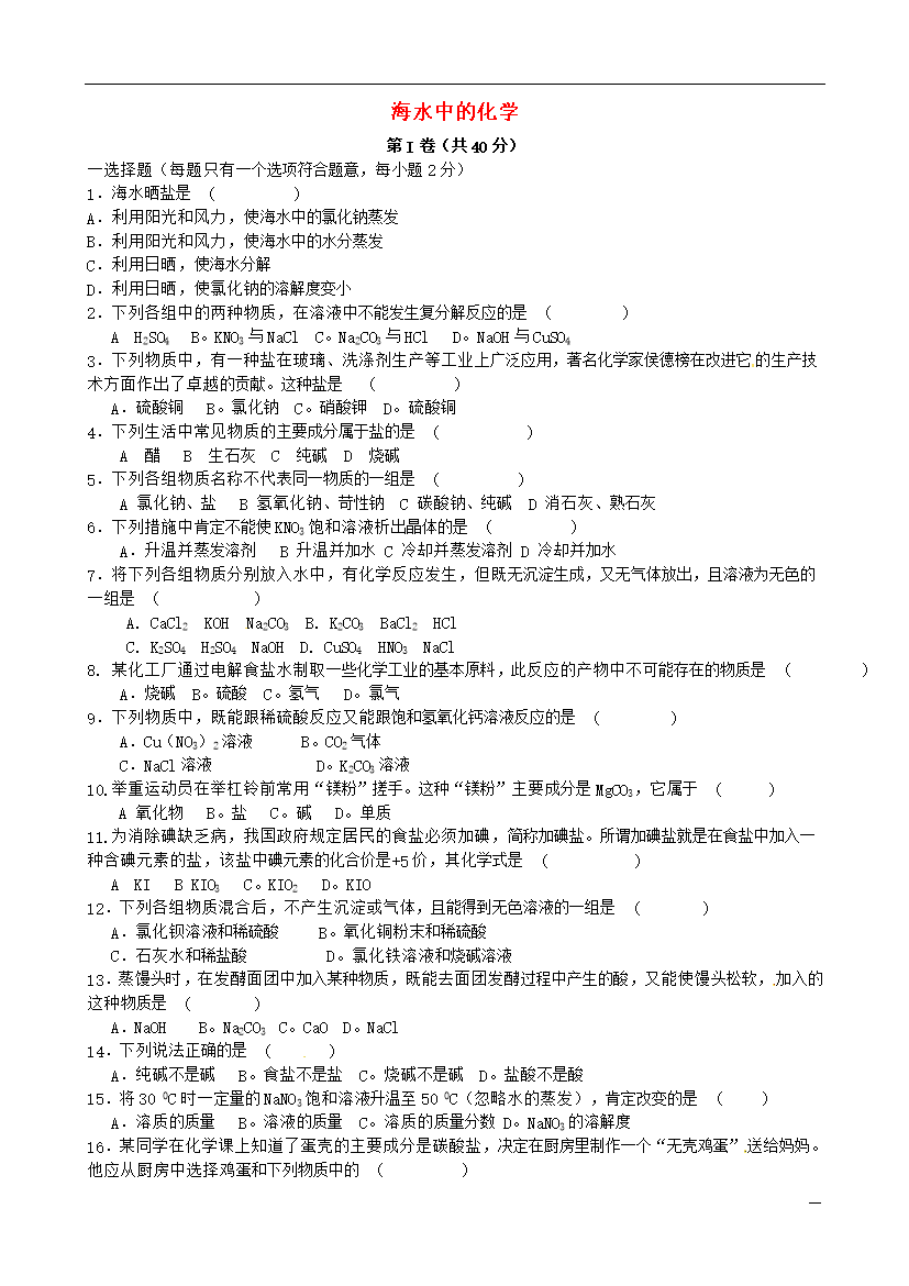 试题-山东-2016_山东省文登区天福山中学九年级化学全册 第八单元 海水中的化学测试题(无答案)(新版)鲁教版