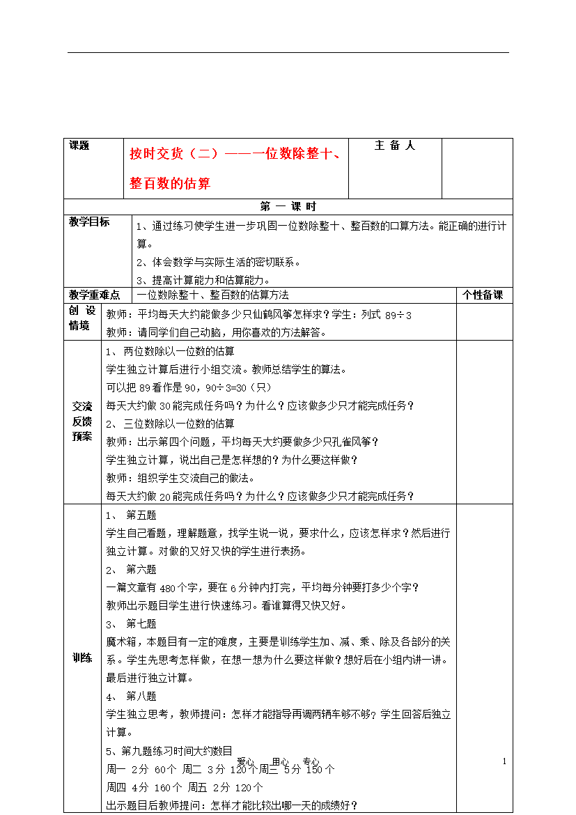 教案-全国-2010_三年级数学上册 一位数除整十、整百数的估算教案 青岛版