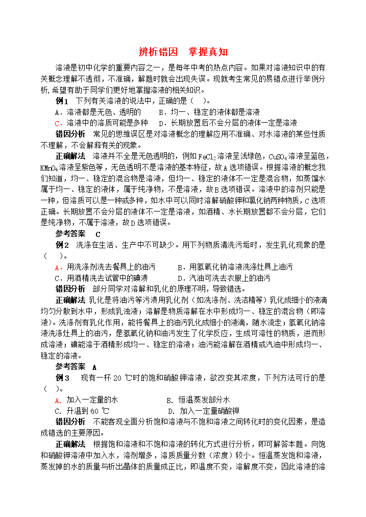 素材-全国-2017_2016-2017学年九年级化学全册 第3单元 溶液 辨析错因 掌握真知释疑解析素材 (新版)鲁教版