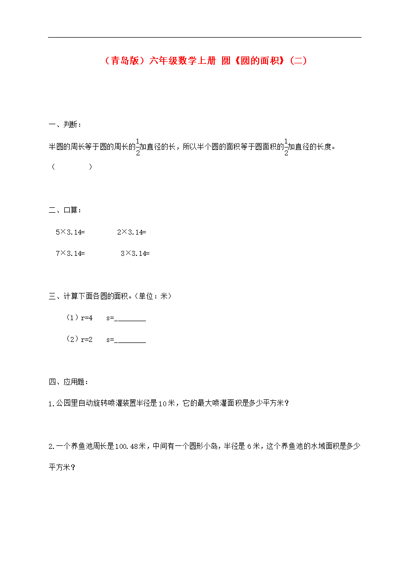 教案-全国-2011_六年级数学上册 圆《圆的面积》(二)教案 青岛版