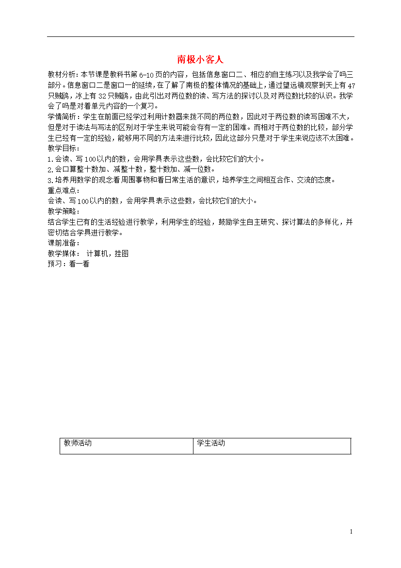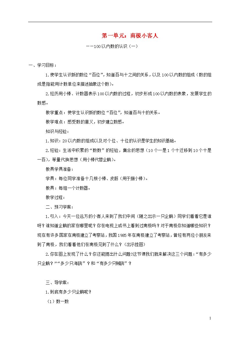 教案-全国-2012_一年级数学下册 南极小客人3教案 青岛版五年制