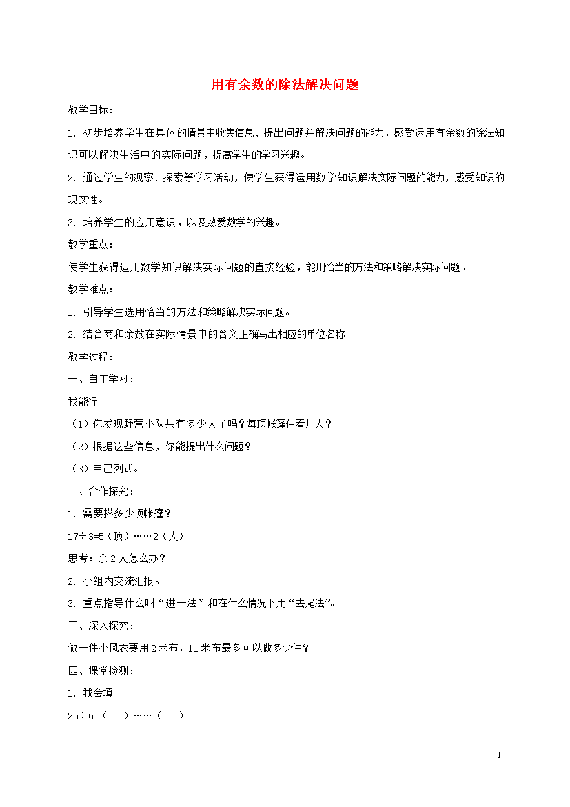 教案-全国-2012_二年级数学下册 用有余数的除法解决问题教案 青岛版