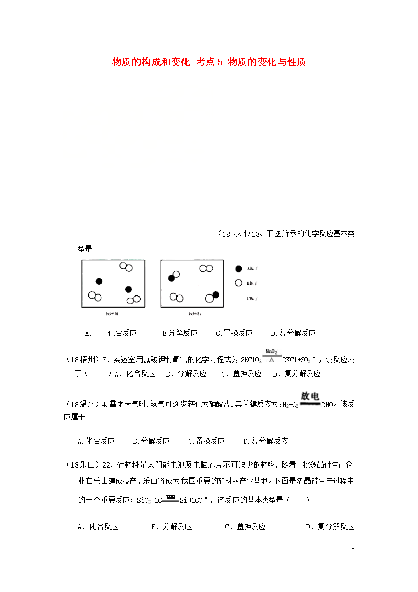 试题-全国-2018_2018年中考化学真题分类汇编 1 物质的构成和变化 考点5 物质的变化与性质 4化学反应 3反应类型(无答案)