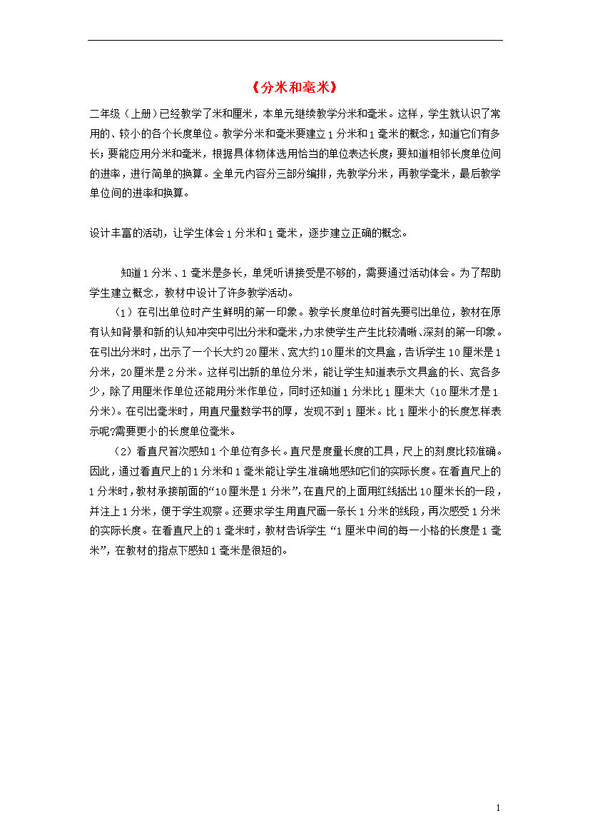 教案-全国-2014_二年级数学下册 分米和毫米教案(1) (新版)苏教版