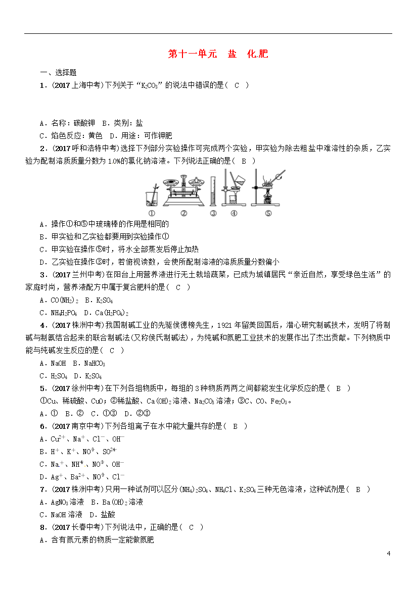 试题-全国-2017_(青海专版)2018中考化学复习 第1编 教材知识梳理篇 第11单元 盐 化肥(精练)试题