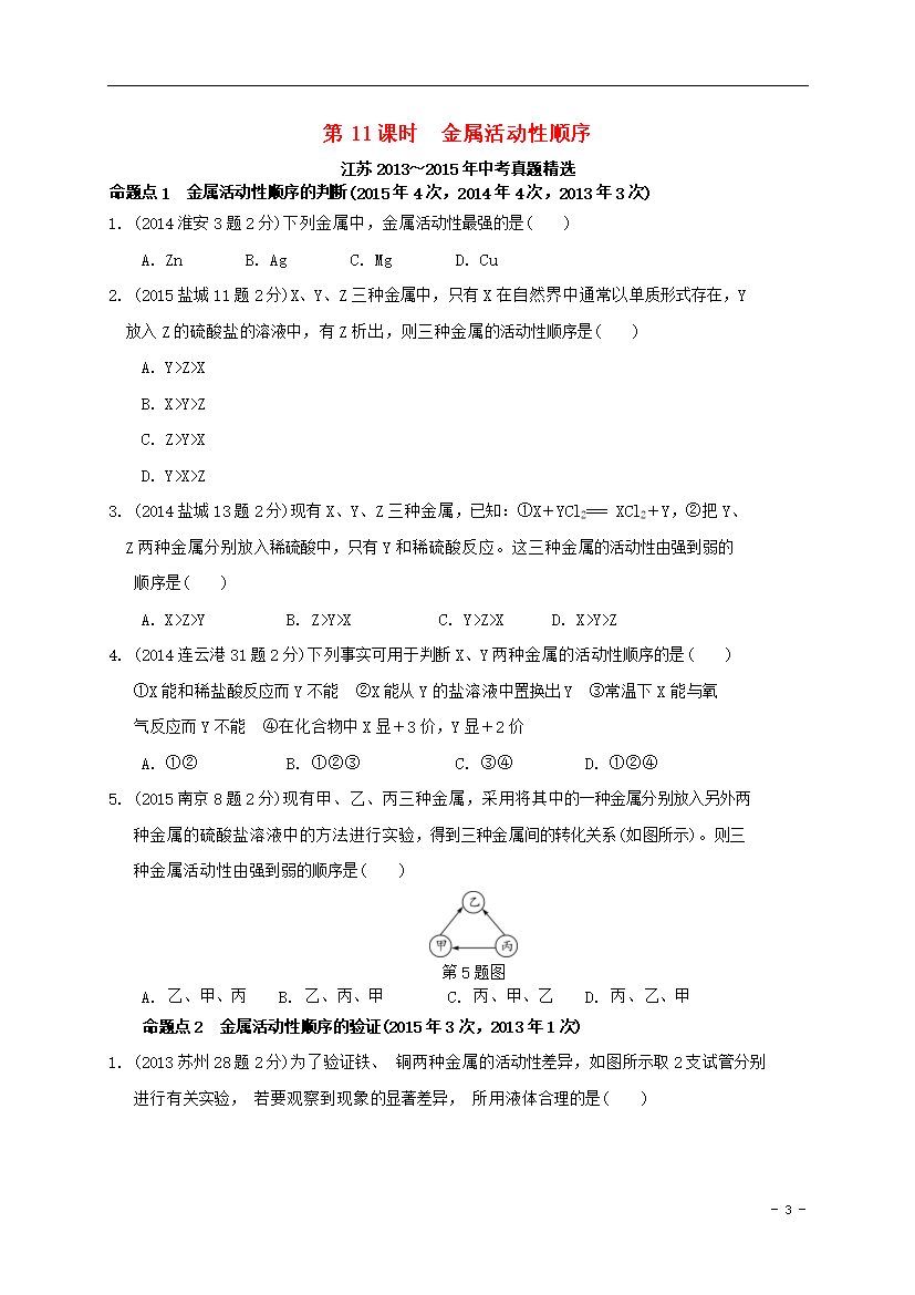 试题-江苏-2016_江苏省2016届中考化学复习讲练 第11课时 金属活动性顺序(13-15年真题精选,含解析)