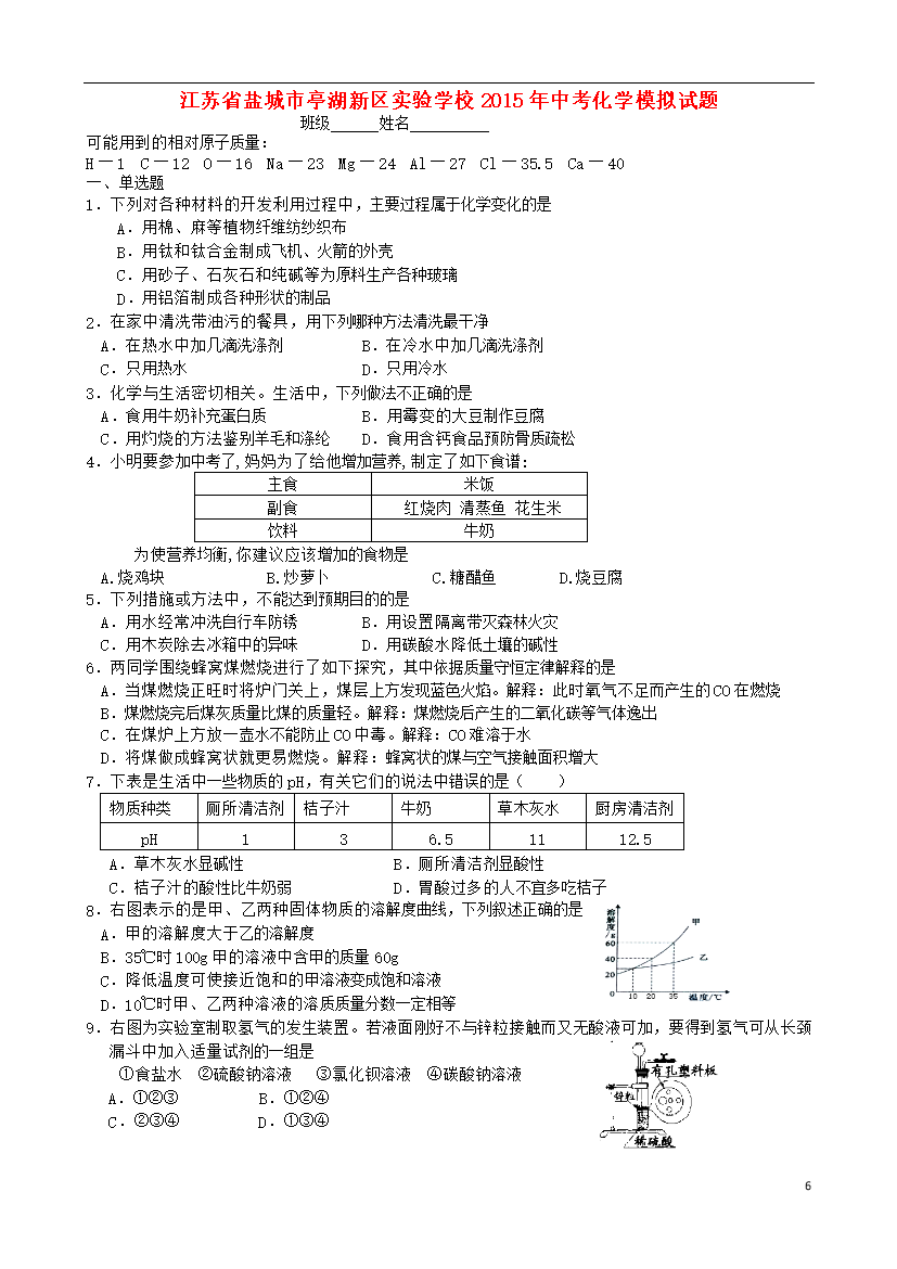 试题-江苏-2016_江苏省盐城市亭湖新区实验学校2015年中考化学模拟试题