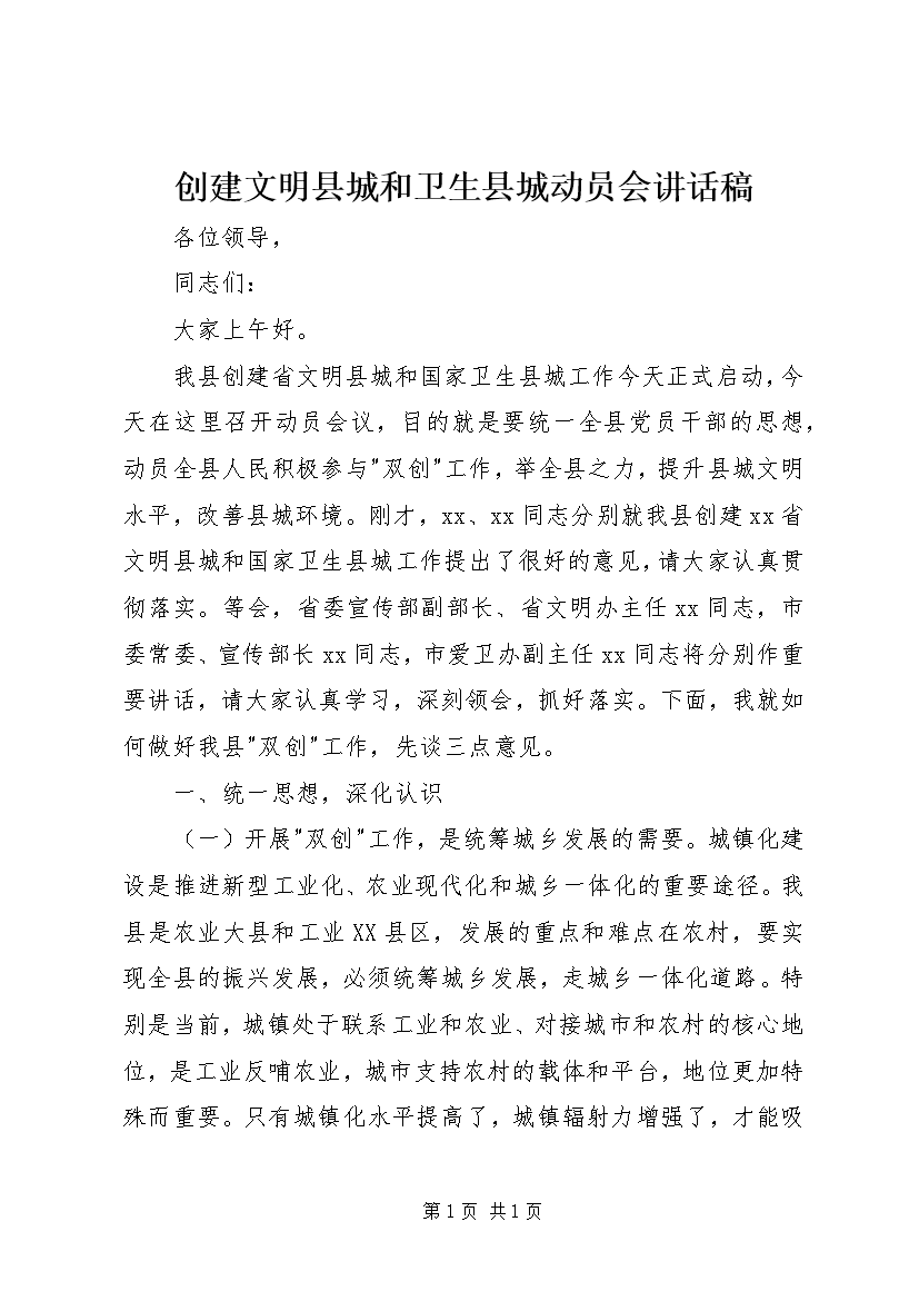 创建文明县城和卫生县城动员会讲话稿 (2)
