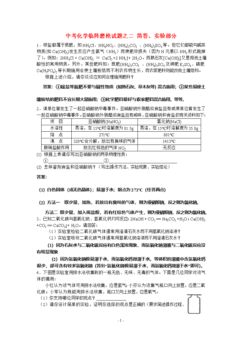 试题-全国-2010_九年级化学中考临阵磨枪试题之二 简答、实验部分全国通用