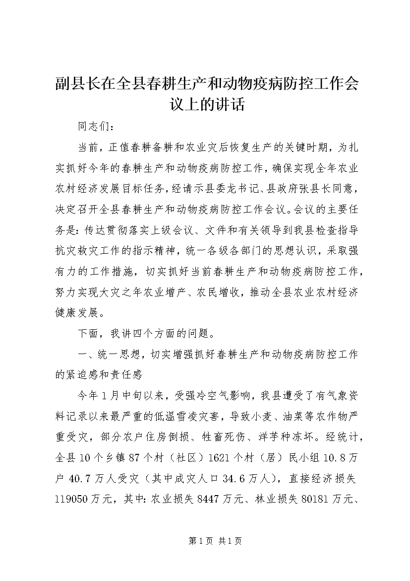 副县长在全县春耕生产和动物疫病防控工作会议上的讲话