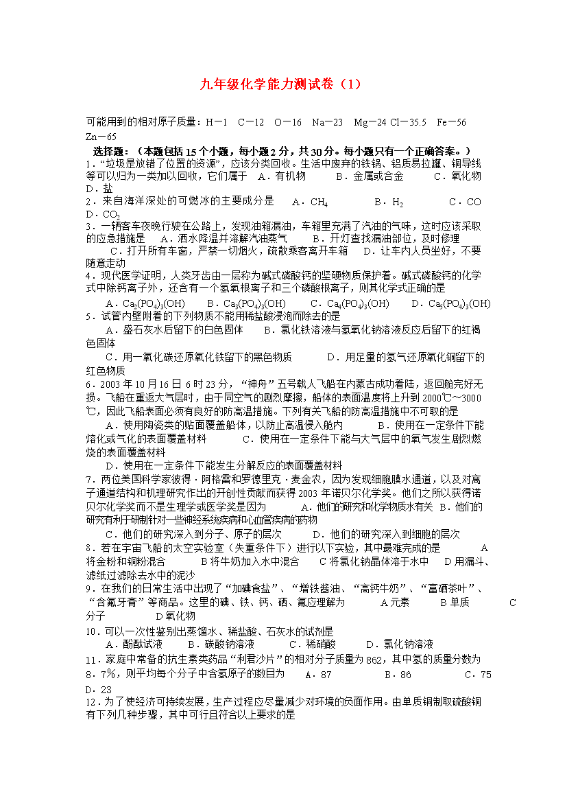 试题-全国-2010_九年级中考化学能力测试卷(1)综合测试全国通用