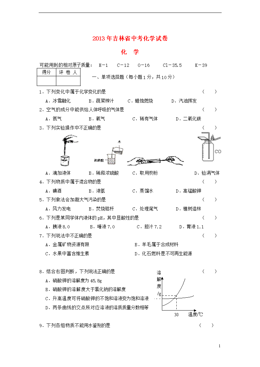 试题-吉林-2013_吉林省2013年中考化学真题试题