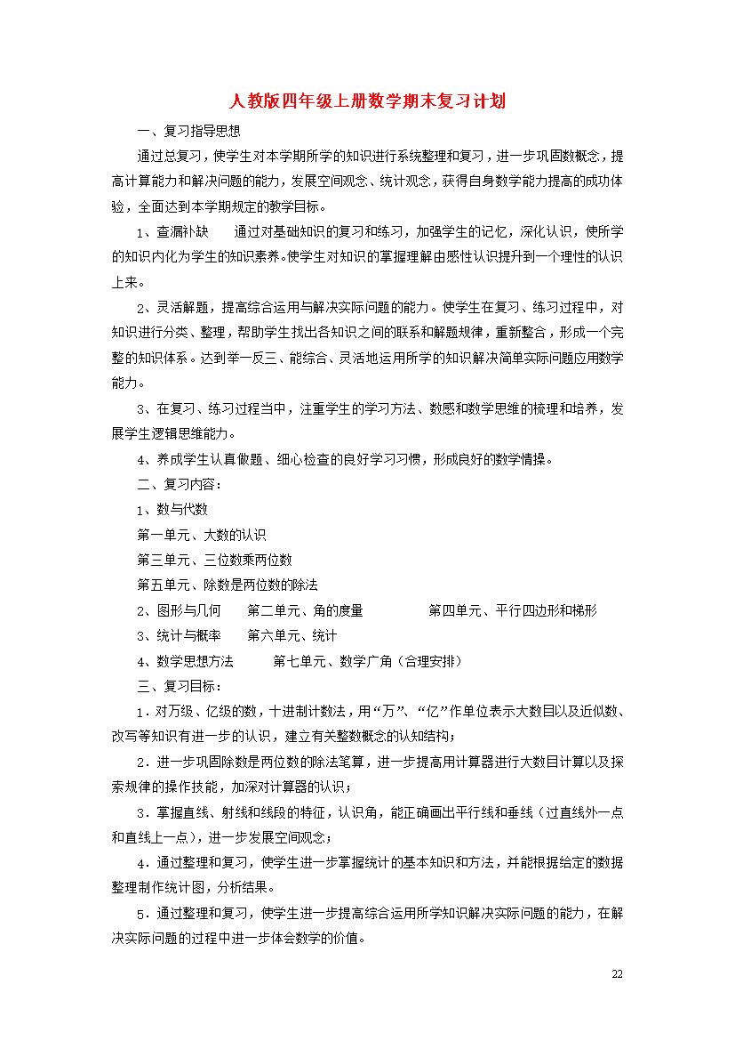 素材-全国-2019_2019秋四年级数学上册 期末复习教学计划素材 新人教版