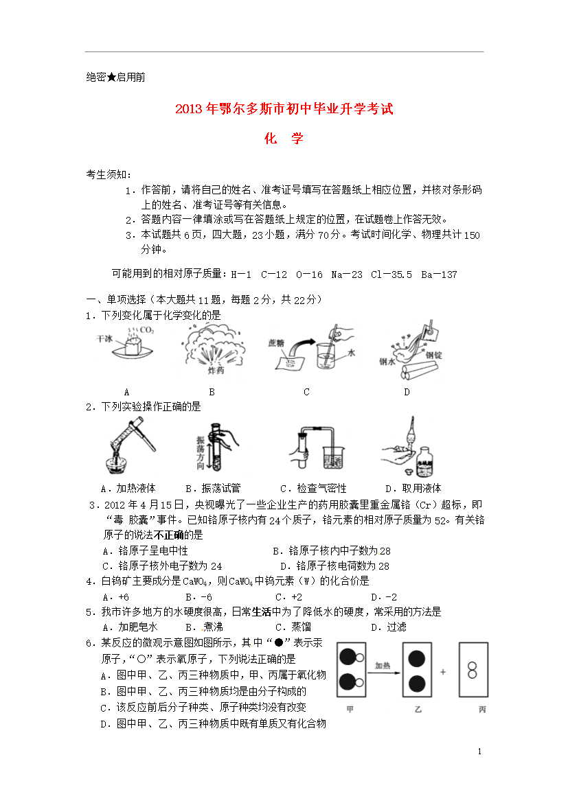 试题-内蒙古-2013_内蒙古鄂尔多斯市2013年中考化学真题试题