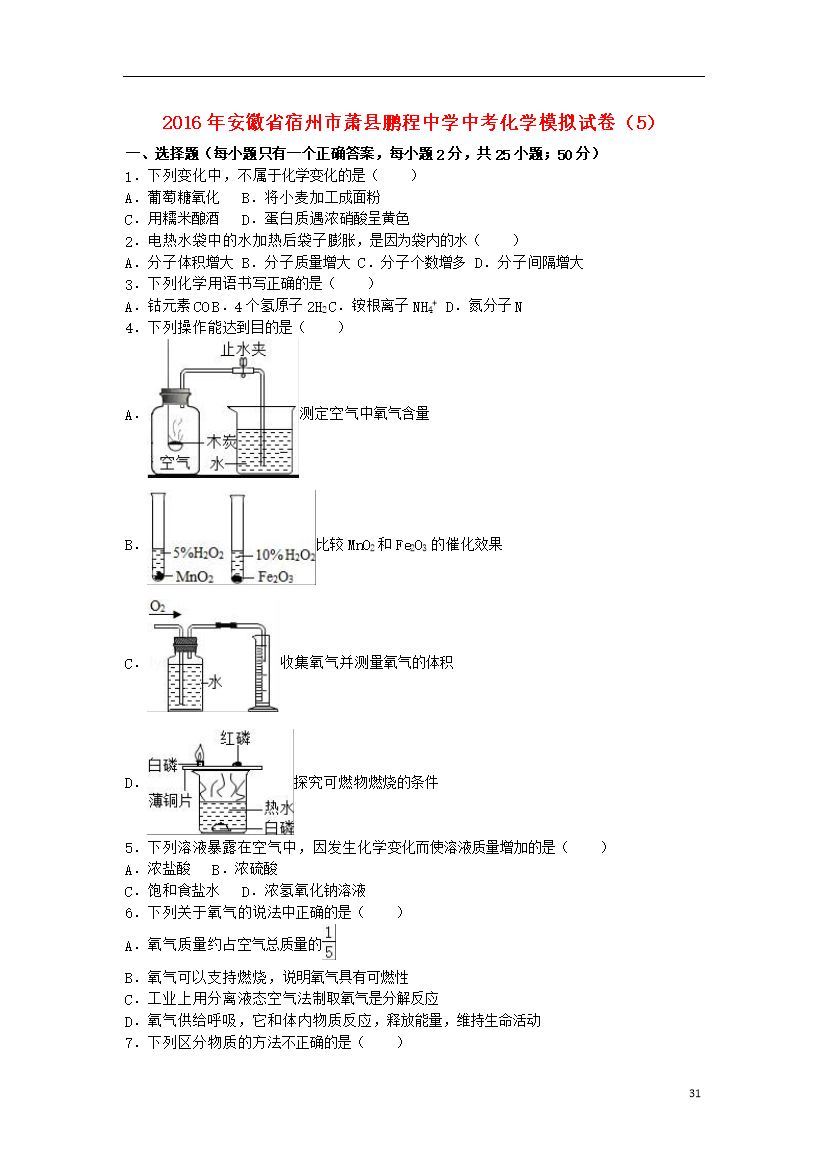 试题-安徽-2016_安徽省宿州市萧县鹏程中学2016年中考化学模拟试卷(5)(含解析)