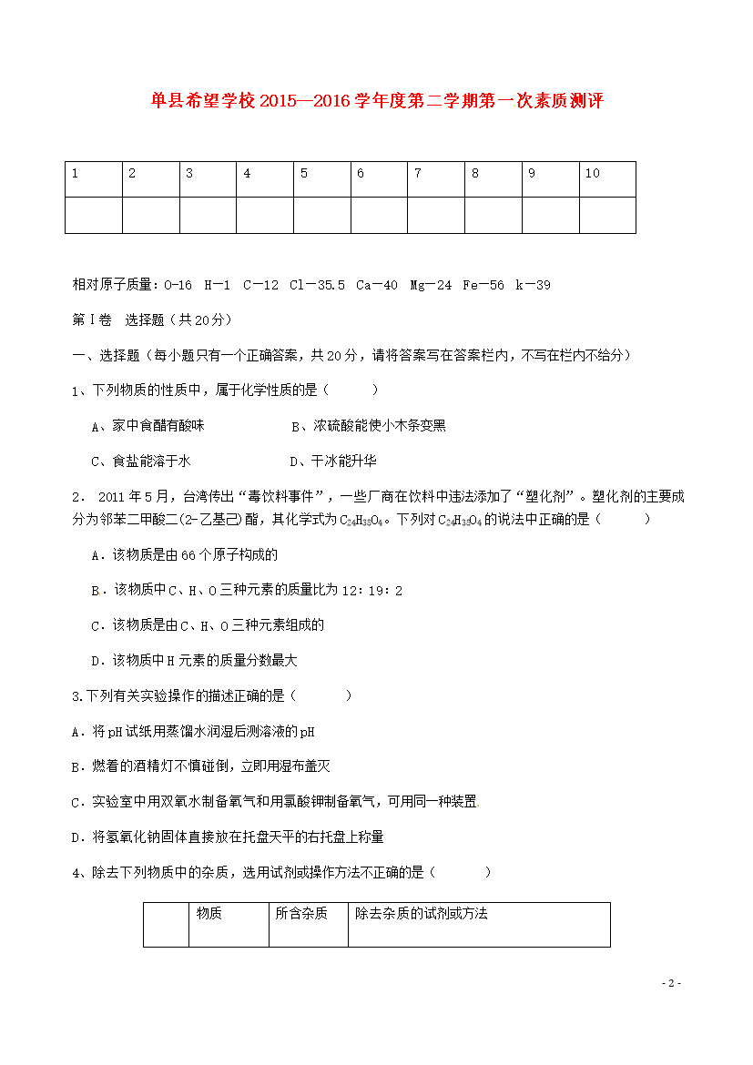 试题-山东-2016_山东省单县希望初级中学2016届九年级化学下学期第一次月考试题(无答案)