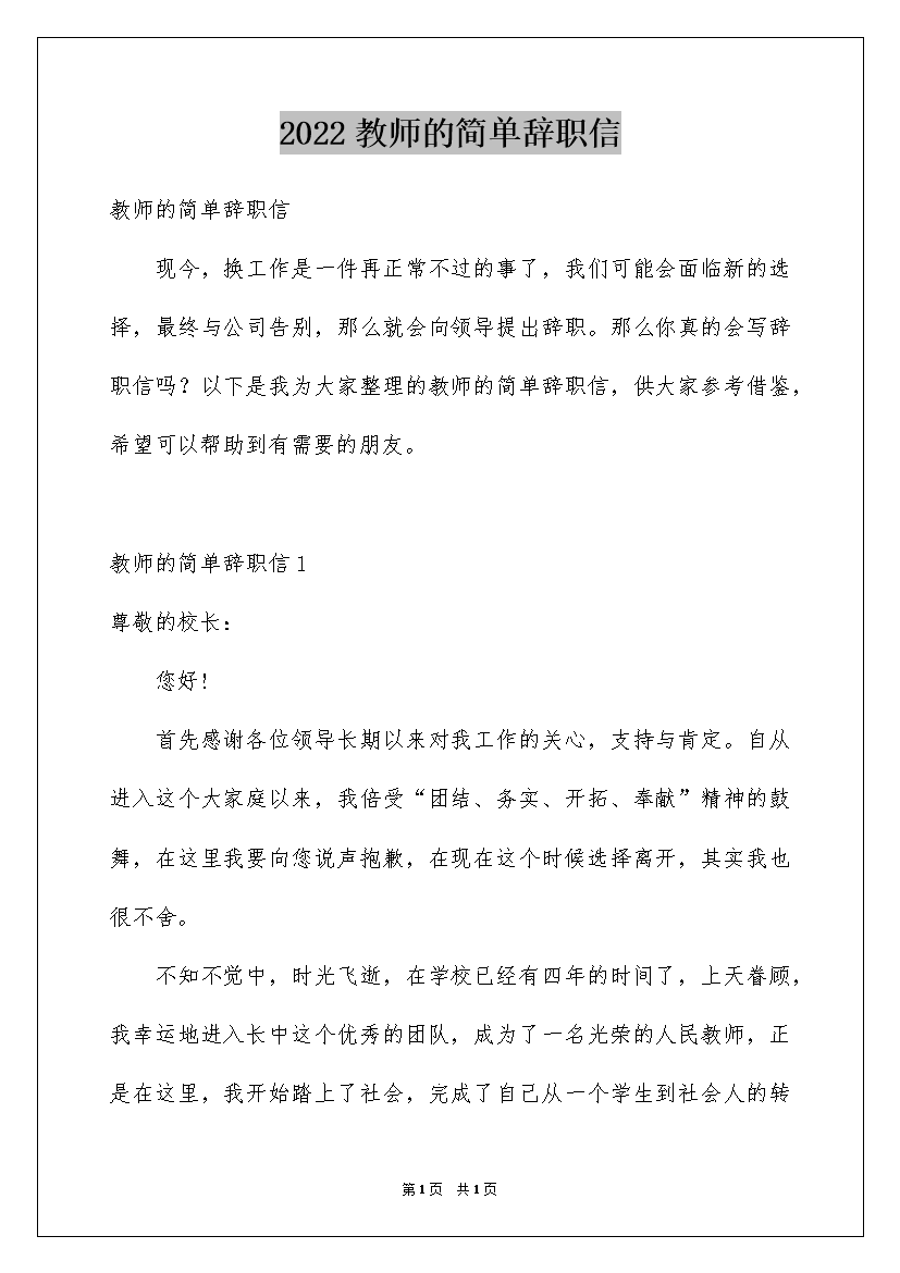 2022教师的简单辞职信