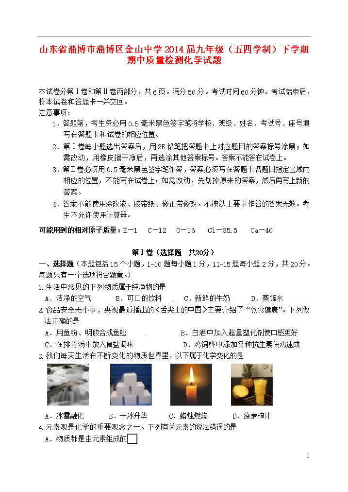 试题-山东-2014_山东省淄博市淄博区金山中学2014届九年级化学下学期期中质量检测试题 五四制